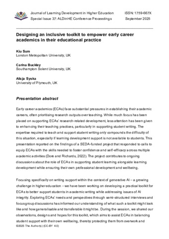 Sum, Kiu, Buckley, Carina and Syska, Alicja (2025) Designing an inclusive toolkit to empower Early Career Academics in their educational practice. Journal of Learning Development in Higher Education (37). pp. 1-5. ISSN 1759-667X