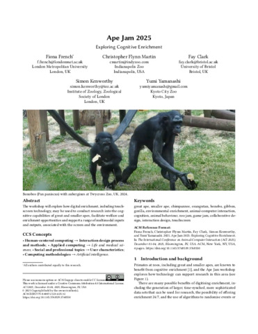 French, Fiona, Martin, Christopher Flynn, Clarke, Fay, Kenworthy, Simon and Yamanashi, Yumi (2025) Ape jam 2025: exploring cognitive enrichment. In: Ape Jam at The International Conference on Animal-Computer Interaction conference, 1-4 December 2025, Indianapolis Zoo. (In Press)