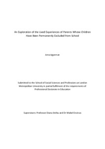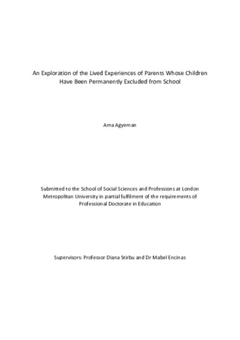 Agyeman, Ama (2024) An exploration of the lived experiences of parents whose children have been permanently excluded from school. Doctoral thesis, London Metropolitan University.