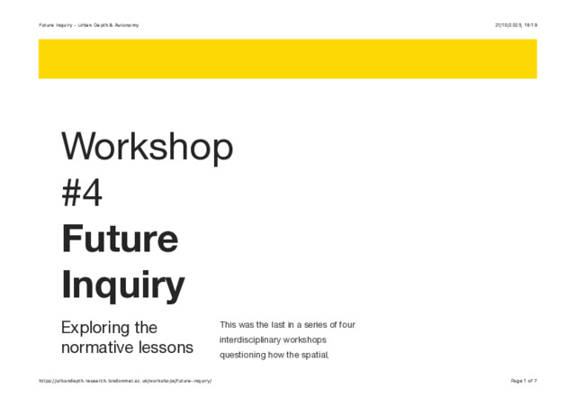 Clossick, Jane, Colburn, Ben and Parr, Hannah (2021) Urban Depth & Autonomy Workshops 2021. London Metropolitan University.