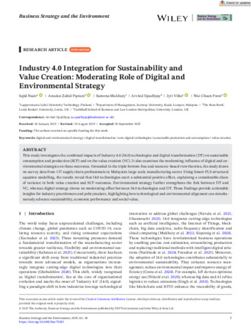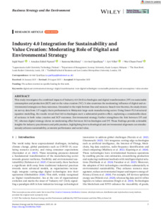 Nazir, Sajid, Piprani, Arsalan Zahid, Mukhuty, Sumona, Upadhyay, Arvind, Vilko, Jyri and Poon, Wai Chuen (2025) Industry 4.0 integration for sustainability and value creation: moderating role of digital and environmental strategy. Business Strategy and the Environment. pp. 1-18. ISSN 1099-0836