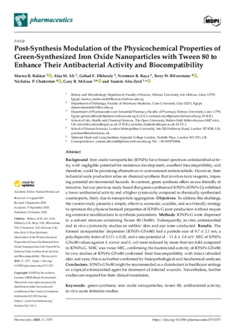 Bakkar, Marwa R., Ali, Alaa M., Elkhouly, Gehad E., Raya, Nermeen R., Bilverstone, Terry W., Chatterton, Nicholas P., McLean, Gary R. and Abo-zeid, Yasmin (2025) Post-synthesis modulation of the physicochemical properties of green-synthesized iron oxide nanoparticles with Tween 80 to enhance their antibacterial activity and biocompatibility. Pharmaceutics, 17(11) (1371). pp. 1-27. ISSN 1999-4923