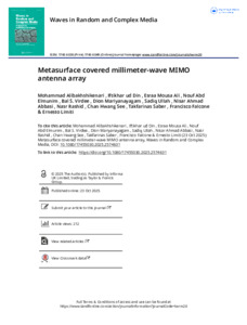 Alibakhshikenari, Mohammad, Din, Iftikhar Ud, Ali, Esraa Mousa, Abd Elmunim, Nouf, Virdee, Bal Singh, Mariyanayagam, Dion, Ullah, Sadiq, Abbasi, Nisar Ahmad, Rashid, Nasr, See, Chan Hwang, Saber, Takfarinas, Falcone, Francisco and Limiti, Ernesto (2025) Metasurface covered millimeter-wave MIMO antenna array. Waves in Random and Complex Media. pp. 1-16. ISSN 1745-5049