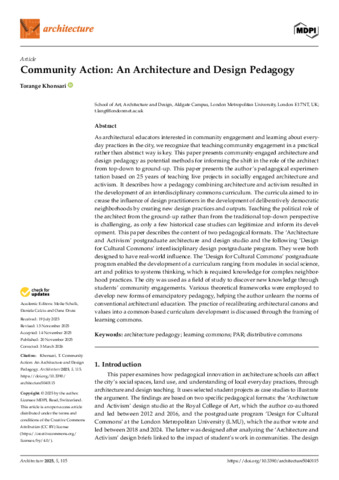 Khonsari, Torange (2025) Community action: an architecture and design pedagogy. Architecture, 5 (4) (115). pp. 1-18. ISSN 2673-8945