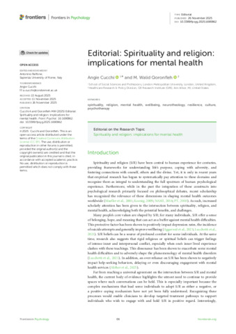 Cucchi, Angie and Qoronfleh, M. Walid (2025) Editorial: Spirituality and religion: implications for mental health. Frontiers in Psychology, 16: 1690862. pp. 1-4. ISSN 1664-1078