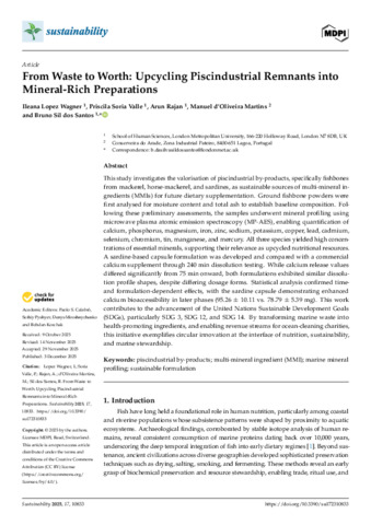 Lopez Wagner, Ileana, Soria Valle, Priscila, Rajan, Arun, D'Oliveira Martins, Manuel and Sil dos Santos, Bruno (2025) From waste to worth: upcycling piscindustrial remnants into mineral-rich preparations. Sustainability, 17(23) (10833). pp. 1-13. ISSN 2071-1050