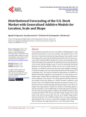 Ugwunze, Ngozika Blessing, Iworiso, Jonathan, Stasinopoulos, Dimitrios Mikis and Hossain, Abu (2025) Distributional forecasting of the U.S. stock market with generalised additive models for location, scale and shape. Journal of Data Analysis and Information Processing, 14 (1). pp. 1-22. ISSN 2327-7203