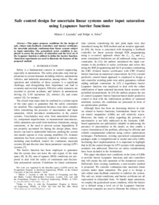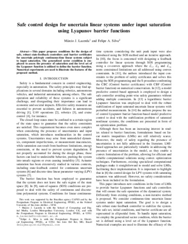 Lacerda, Marcio J. and Silva, Felipe A. (2025) Safe control design for uncertain linear systems under input saturation using Lyapunov barrier functions. In: 64th IEEE Conference on Decision and Control, 10-12 December 2025, Rio de Janeiro, Brazil. (In Press)