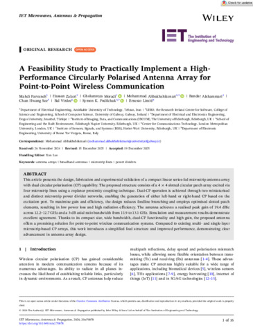 Parvaneh, Mahdi, Zakeri, Hassan, Moradi, Gholamreza, Alibakhshikenari, Mohammad, Alshammari, Bandar, See, Chan Hwang, Virdee, Bal Singh, Podilchak, Symon K. and Limiti, Ernesto (2026) A feasibility study to practically implement a high‐performance circularly polarised antenna array for point‐to‐point wireless communication. IET Microwaves, Antennas & Propagation, 20(1) (e70078). pp. 1-16. ISSN 1751-8725