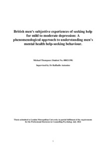 Thompson, Michael (2022) British men’s subjective experiences of seeking help for mild to moderate depression: a phenomenological approach to understanding men’s mental health help-seeking behaviour. Doctoral thesis, London Metropolitan University.