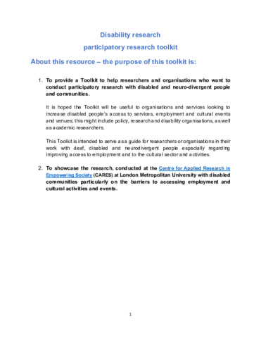 This Toolkit is intended to serve as a guide for researchers or organisations in their work with deaf, disabled and neurodivergent people especially regarding improving access to employment and to the cultural sector and activities. and to showcase the research, conducted at the Centre for Applied Research in Empowering Society (CARES) at London Metropolitan University with disabled communities particularly on the barriers to accessing employment and cultural activities and events.