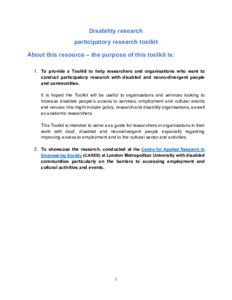 Based on the findings and experience of conducting three participatory research projects with disabled people this toolkit has been produced to help researchers and organisations who want to conduct participatory research with disabled and neuro-divergent people and communities.