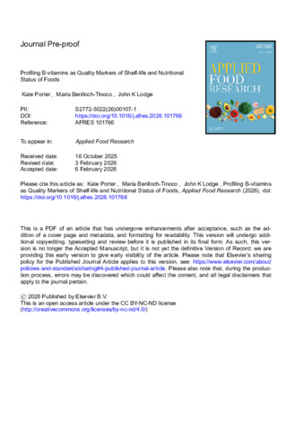 Porter, Kate, Benlloch-Tinoco, Maria and Lodge, John K. (2026) Profiling B-vitamins as quality markers of shelf-life and nutritional status of foods. Applied Food Research (101766). pp. 1-24. ISSN 27725022