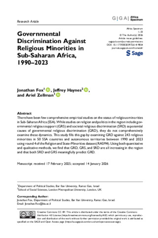 Fox, Jonathan, Haynes, Jeffrey and Zellman, Ariel (2026) Governmental discrimination against religious minorities in Sub-Saharan Africa, 1990-2023. Africa Spectrum: 0002039726. pp. 1-33. ISSN 1868-6869