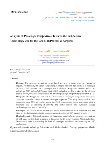 Tyagi, Sarika and Lodewijks, Gabriel (2025) Analysis of passenger perspectives towards the self-service technology use for the check-in process at airports. Journal of Airline and Airport Management, 15 (2). pp. 69-89. ISSN 2014-4806