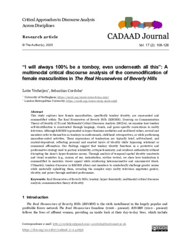 Verheijen, Lotte and Cordoba, Sebastian (2025) “I will always 100% be a tomboy, even underneath all this”: a multimodal critical discourse analysis of the commodification of female masculinities in The Real Housewives of Beverly Hills. CADAAD Journal, 17 (2). pp. 108-126. ISSN 1752-3079