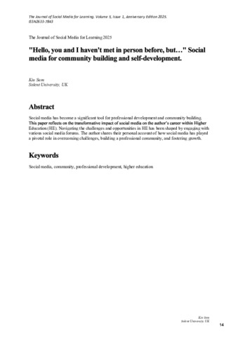Sum, Kiu (2026) "Hello, you and I haven't met in person before, but…" Social media for community building and self-development. Journal of Social Media for Learning, 5 (1). pp. 14-17. ISSN 2633-7843