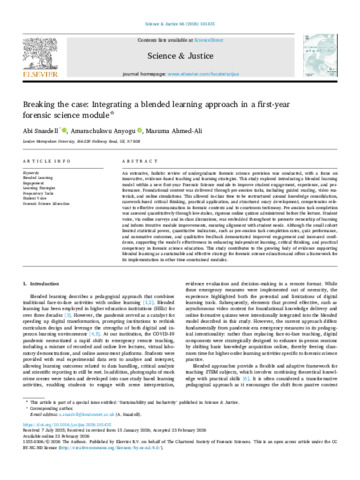 Snasdell, Abi, Anyogu, Amarachukwu and Ahmed-Ali, Masuma (2026) Breaking the case: Integrating a blended learning approach in a first-year forensic science module. Science and Justice, 66 (3). p. 101425. ISSN 1355-0306