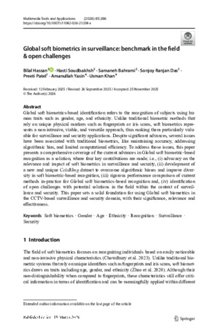 Hassan, Bila, Soudbakhsh, Hasti, Bahrami, Samaneh, Das, Sonjoy Ranjan, Patel, Preeti, Yasin, Amanullah and Khan, Usman (2026) Global soft biometrics in surveillance: benchmark in the field & open challenges. Multimedia Tools and Applications, 85 (4) (286): 286. pp. 1-29. ISSN 1573-7721