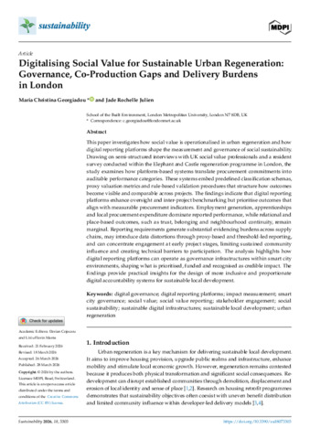 Georgiadou, Maria Christina and Julien, Jade Rochelle (2026) Digitalising social value for sustainable urban regeneration: governance, co-production gaps and delivery burdens in London. Sustainability, 18 (7). p. 3303. ISSN 2071-1050