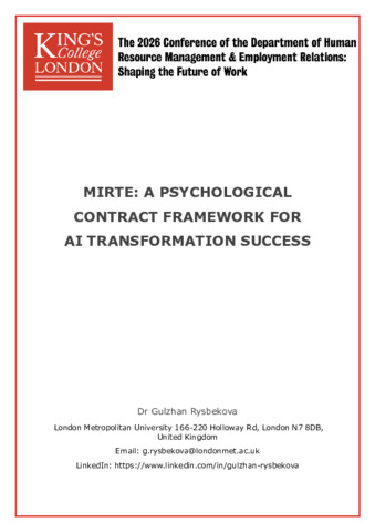 Rysbekova, Gulzhan (2026) MIRTE: a psychological contract framework for AI transformation success. In: The 2026 Conference of the Department of Human Resource Management & Employment Relations: Shaping the Future of Work., 6 May, 2026, King's College London, London, UK.