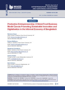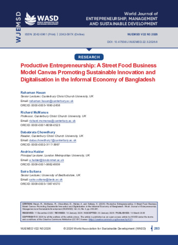 Hasan, Rahaman, McManus, Richard, Chowdhury, Dababrata, Halder, Andrina and Sultana, Saira (2026) Productive entrepreneurship: a street food business model canvas promoting sustainable innovation and digitalisation in the informal economy of Bangladesh. World Journal of Entrepreneurship Management and Sustainable Development, 22 (3): 6. pp. 263-281. ISSN 2042-597X