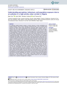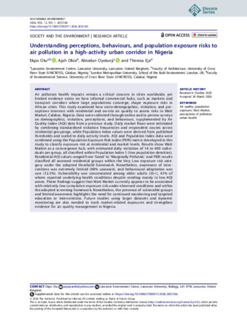Otu, Ekpo, Obia, Ajah, Oyetunji, Abiodun Kolawole and Eja, Theresa (2026) Understanding perceptions, behaviours, and population exposure risks to air pollution in a high-activity urban corridor in Nigeria. Sustainable Environment, 12 (1): 2652166. pp. 1-25. ISSN 2765-8511
