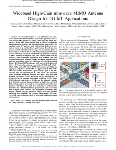 Zakeri, Hassan, Moradi, Gholamreza, Alibakhshikenari, Mohammad, Virdee, Bal Singh, See, Chan Hwang and Koziel, Slawomir (2026) Wideband high-gain mm-wave MIMO antenna design for 5G IoT applications. IEEE Internet of Things Journal. pp. 1-21. ISSN 2327-4662
