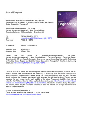 Alibakhshikenari, Mohammad, Virdee, Bal Singh, Qasaymeh, Yazeed Mohammad, Abbasi, Nisar Ahmad, Falcone, Francisco, Saber, Takfarinas and Limiti, Ernesto (2026) 6G mm-wave Nolen-matrix beamformer using groove gap-waveguide technology for tracking space targets and satellite global connectivity through Iot. Results in Engineering (110572). pp. 1-29. ISSN 2590-1230