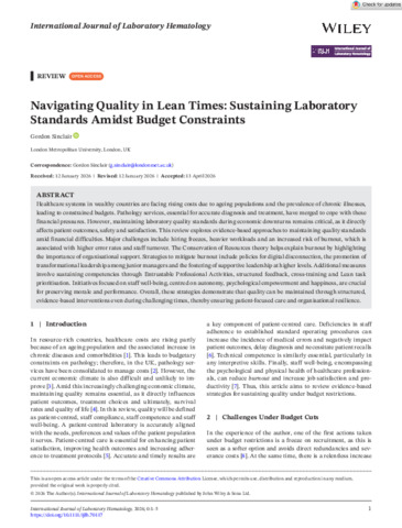 Sinclair, Gordon (2026) Navigating quality in lean times: sustaining laboratory standards amidst budget constraints. International Journal of Laboratory Hematology. pp. 1-5. ISSN 1751-553X
