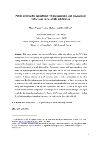 This paper analyses the factors influencing public expenditure on the EU’s Risk Management Toolkit comparing six types of regional-level spatial autoregressive models, and finding that there is a predominance of socio-economic factors over risk and agro-ecological factors in the allocation of budget. Higher expenditure occurs in more affluent regions and in areas with clusters of relatively high welfare. Conversely, regions with high agricultural value added and a greater presence of permanent crops spend less on the Risk Management Toolkit, indicating a trade-off with private risk management products (e.g. insurance) and on-farm practices. A higher intensity of CAP subsidies tends to reduce expenditure on the Risk Management Toolkit, indicating that the income stabilization capacity of direct payments might be an alternative to risk management and indicating a substitution between policies. Moreover, a strong spatial dependence of the regional expenditures indicates a key role of the higher-level institutional environment and political economy processes in the allocation of budget. The paper concludes deriving policy implications for the new CAP reform which is characterized by higher flexibility in deciding what policy instruments to implement at the territorial level.