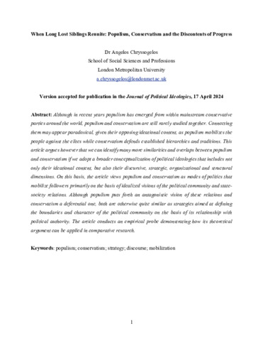 Chryssogelos, Angelos (2025) When long lost siblings reunite: populism, conservatism and the discontents of progress. Journal of Political Ideologies, 30 (3). pp. 667-686. ISSN 1356-9317