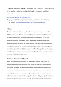 Pérez Andrade, Gonzalo and King, Hannah M. (2024) ‘English as an additional language’, ‘multilingual’, and ‘vulnerable’: a reflexive account of the labelling practices surrounding school pupils in a researcher-practitioner collaboration. Language and Intercultural Communication, 24 (5). pp. 458-474. ISSN 1470-8477