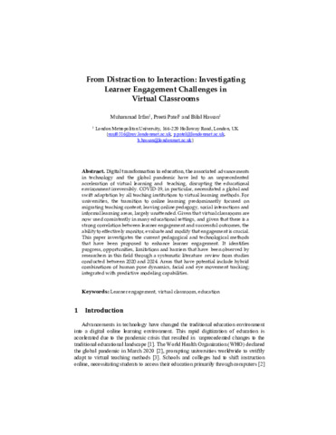 Irfan, Muhammad, Patel, Preeti and Hassan, Bilal (2025) From distraction to interaction: investigating learner engagement challenges in virtual classrooms. In: 12th International Conference on Frontiers of Intelligent Computing: Theory and Applications (FICTA-2024), 6-7 June 2024, London Metropolitan University, London (UK) / Online.