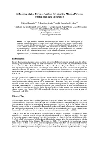 Alemayehu, Mikiyas, Araujo, Istteffanny Isloure and Chrysikos, Alexandros (2025) Enhancing digital forensic analysis for locating missing persons: multimodal data integration. In: 12th International Conference on Frontiers of Intelligent Computing: Theory and Applications (FICTA-2024) June 06 - 07, 2024, 6-7 June 2024, London Metropolitan University, London (UK) / Online.